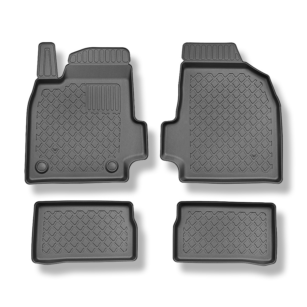 - Las alfombrillas se caracterizan por un diseño moderno con acabado mate. Cada conjunto está hecho a medida para un modelo y generación de coche específicos, garantizando el ajuste perfecto al suelo del vehículo. También se incluyen los enganches, si están disponibles en el modelo de coche.