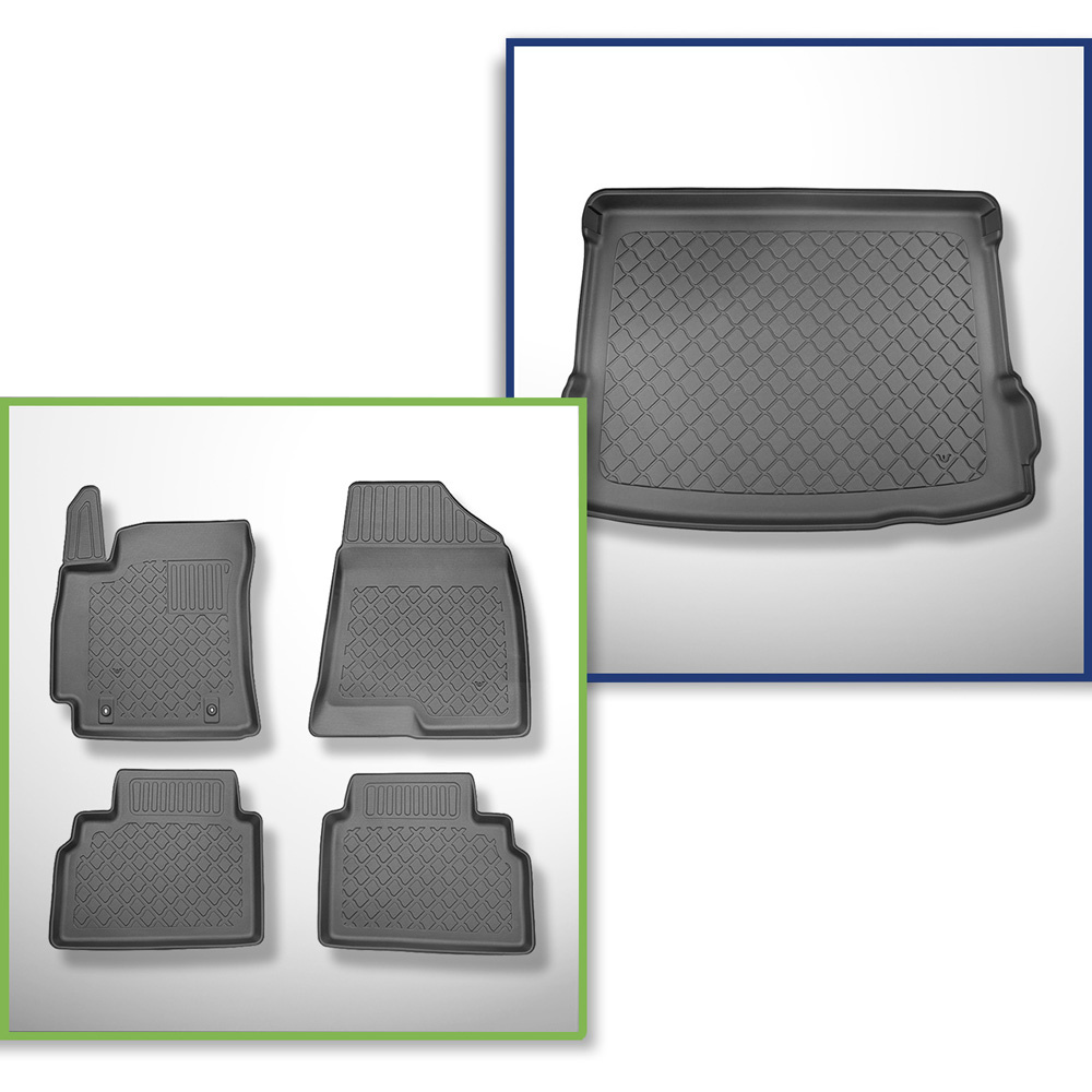 Conjunto de alfombrilla para maletero y alfombrillas para el interior del coche TPE para: Hyundai Kona II SUV (04.2023-....) - maletero superior; suelo móvil en la posición superior; con y sin subwoofer; no para la versión eléctrica; también híbridos