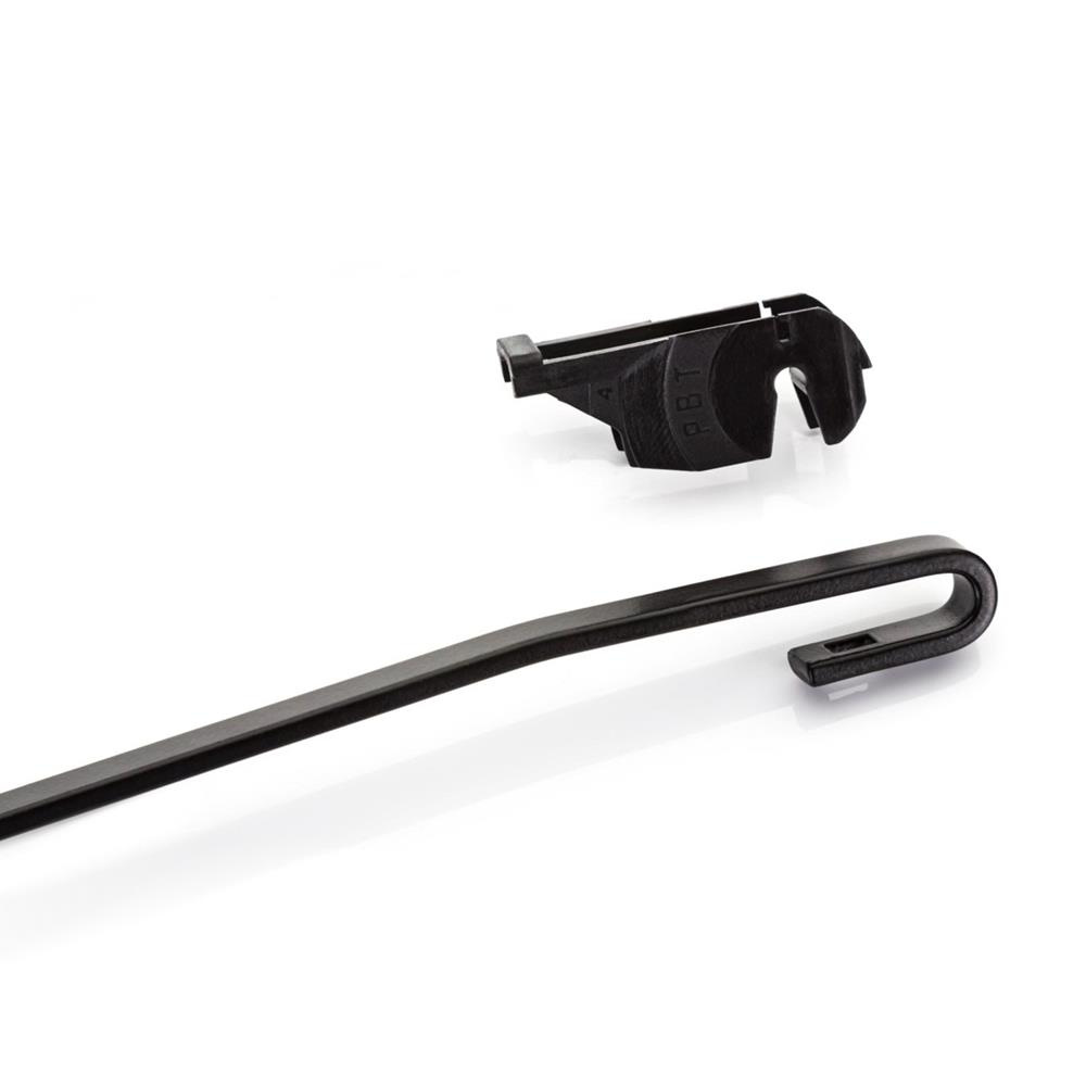 - Las escobillas planas no poseen un marco metálico. El inserto de goma se coloca directamente en los listones elásticos de la escobilla y, gracias a su forma, la escobilla apenas ofrece resistencia al aire. Esta forma del limpiaparabrisas y la ausencia de un marco metálico hacen que toda la escobilla se adhiera mejor al parabrisas.