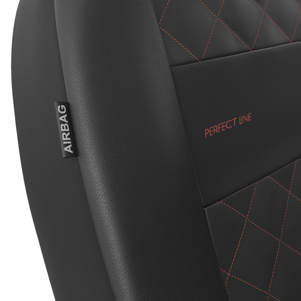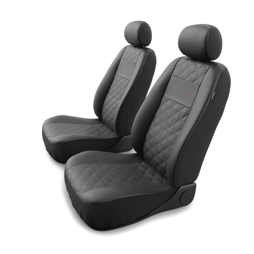 - Las fundas están fabricadas con cuero sintético resistente y antimanchas de color negro. En la parte central cuentan con un acolchado decorativo cosido con hilo de color rojo. Las fundas delanteras están decoradas adicionalmente con un bordado.