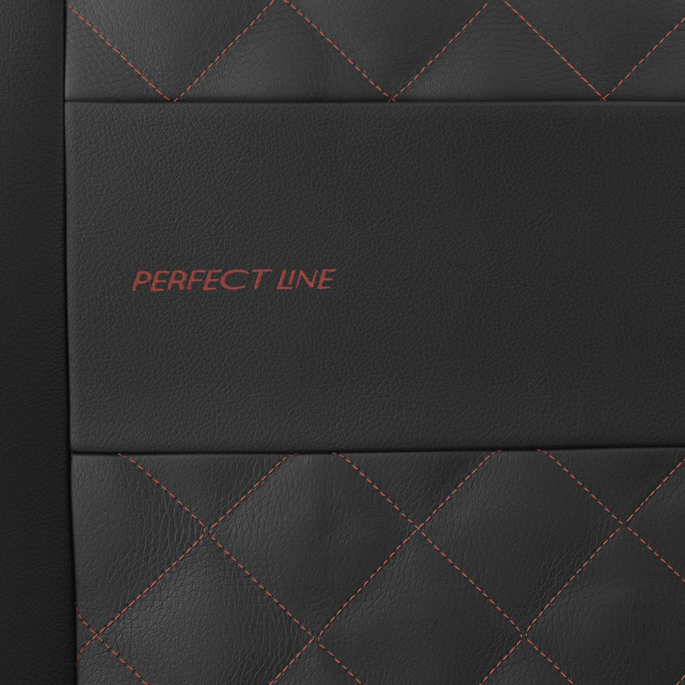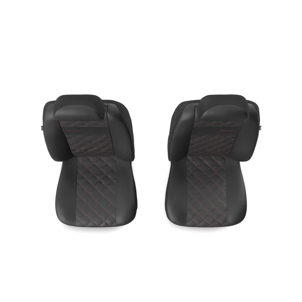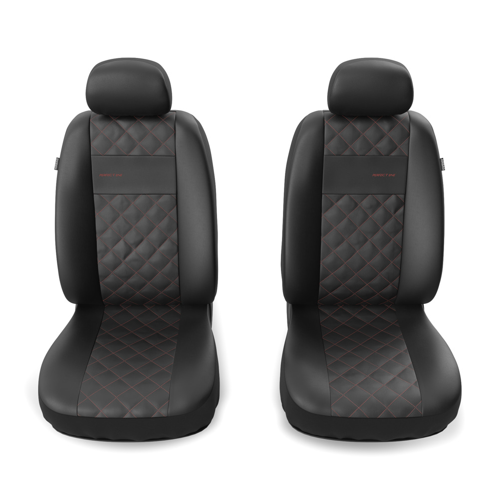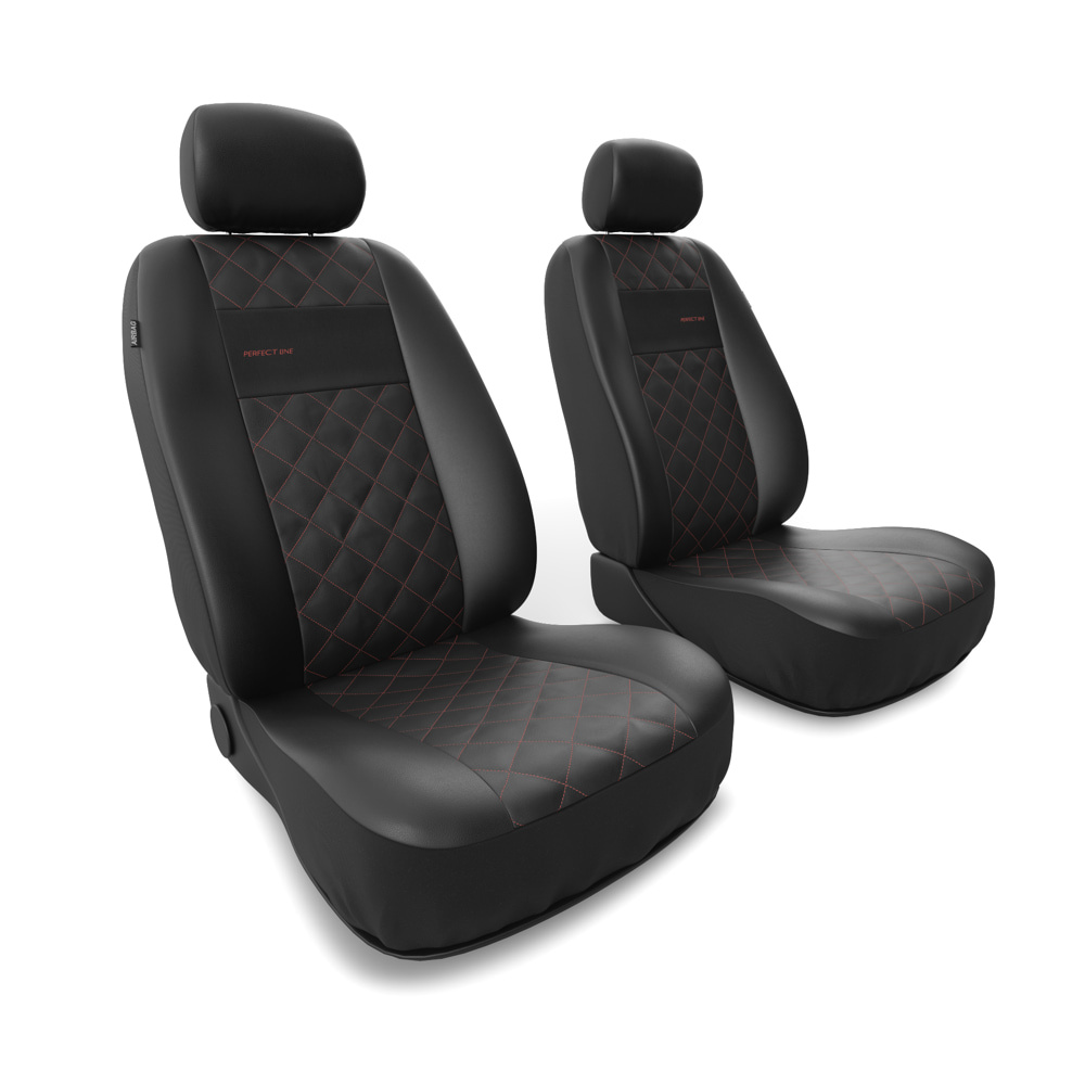 - Las fundas están fabricadas con cuero sintético resistente y antimanchas de color negro. En la parte central cuentan con un acolchado decorativo cosido con hilo de color rojo. Las fundas delanteras están decoradas adicionalmente con un bordado.