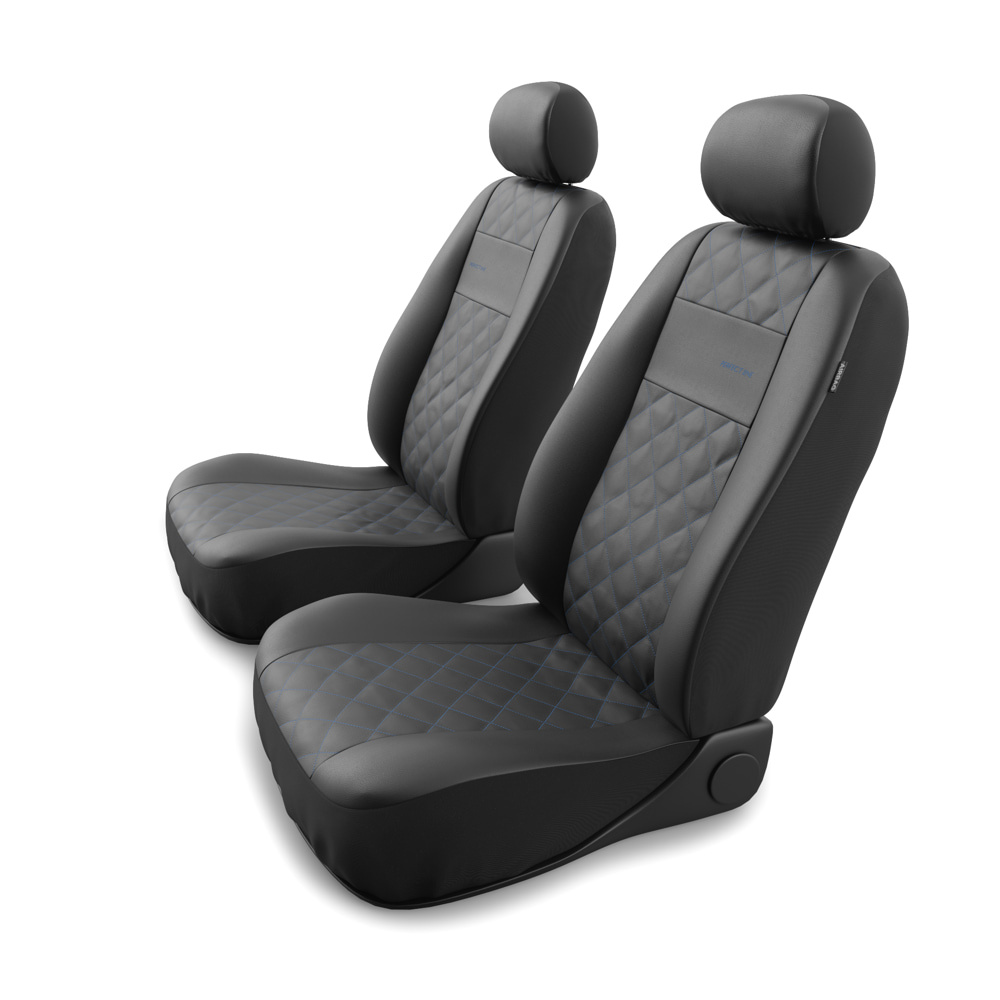 - Las fundas están fabricadas con cuero sintético resistente y antimanchas de color negro. En la parte central cuentan con un acolchado decorativo cosido con hilo de color azul. Las fundas delanteras están decoradas adicionalmente con un bordado.