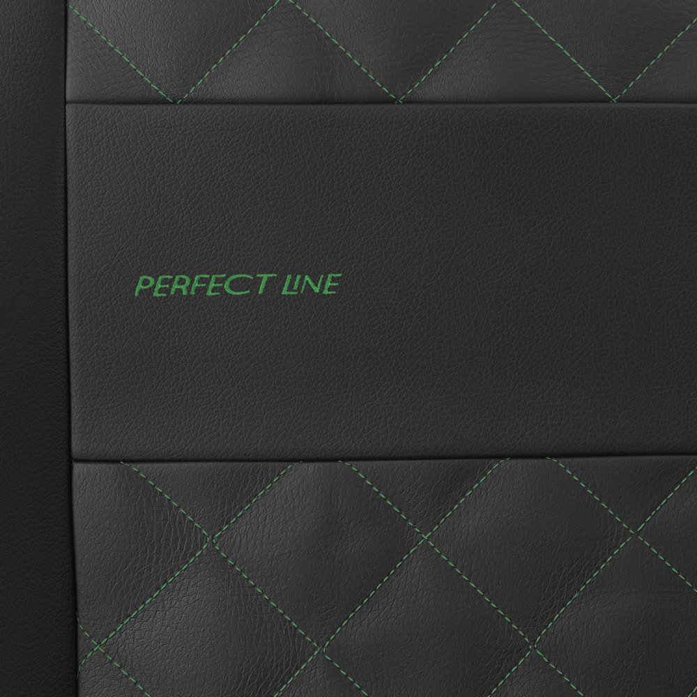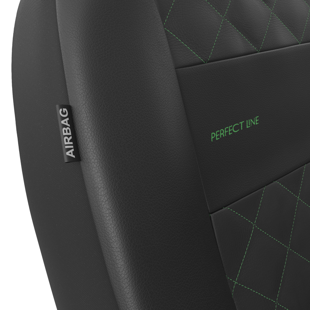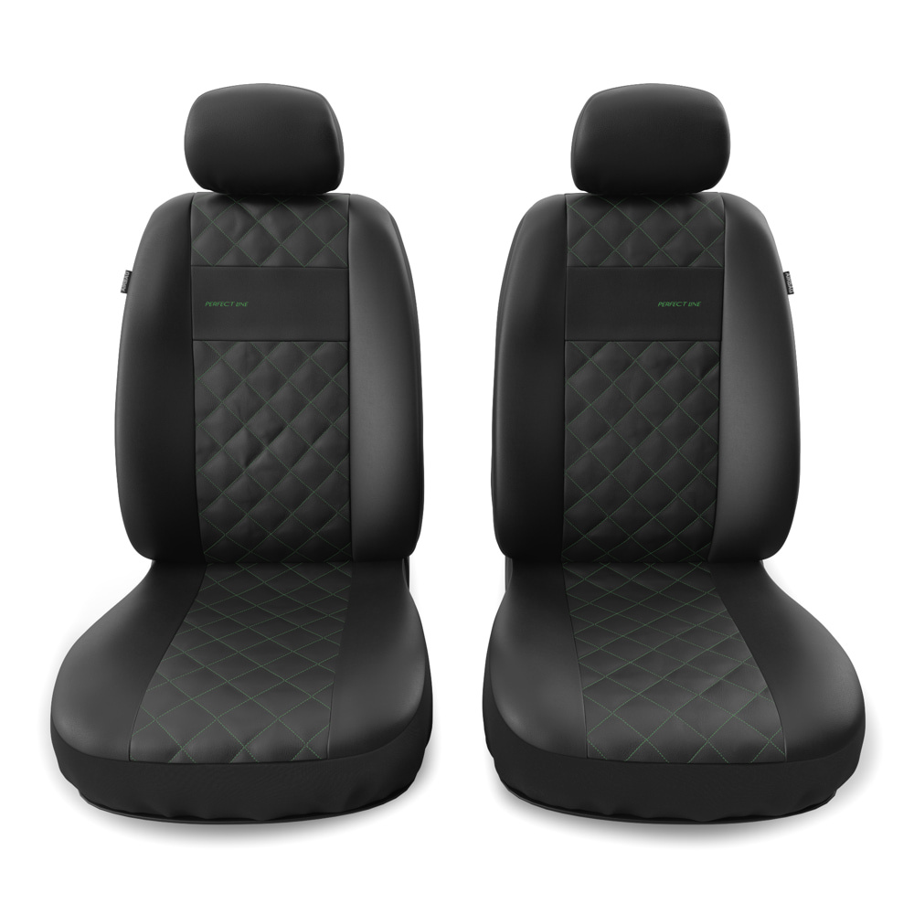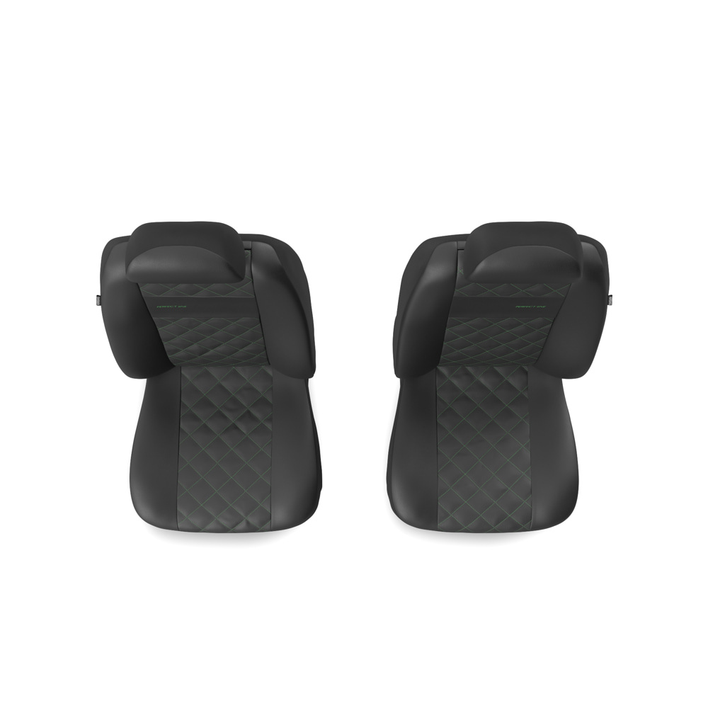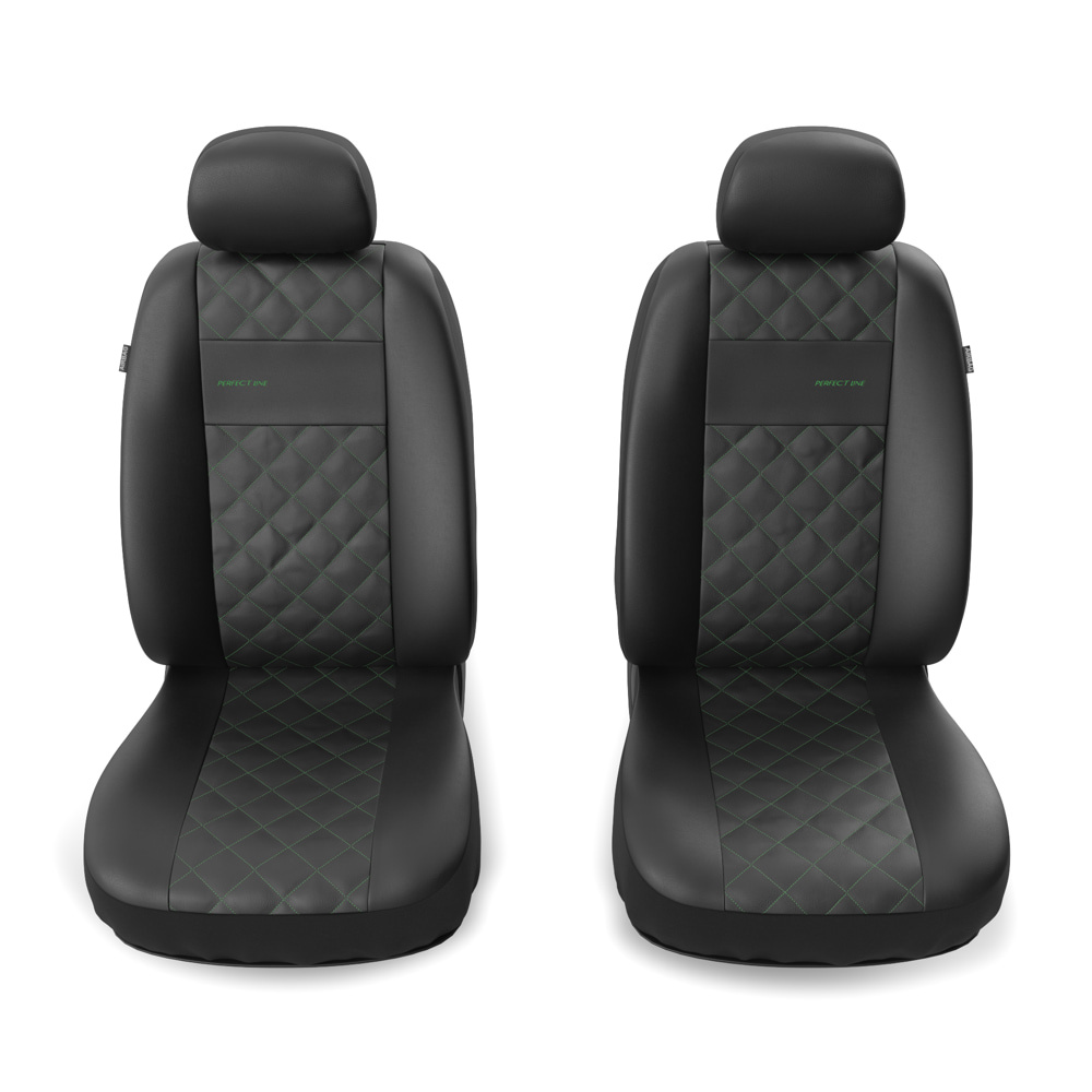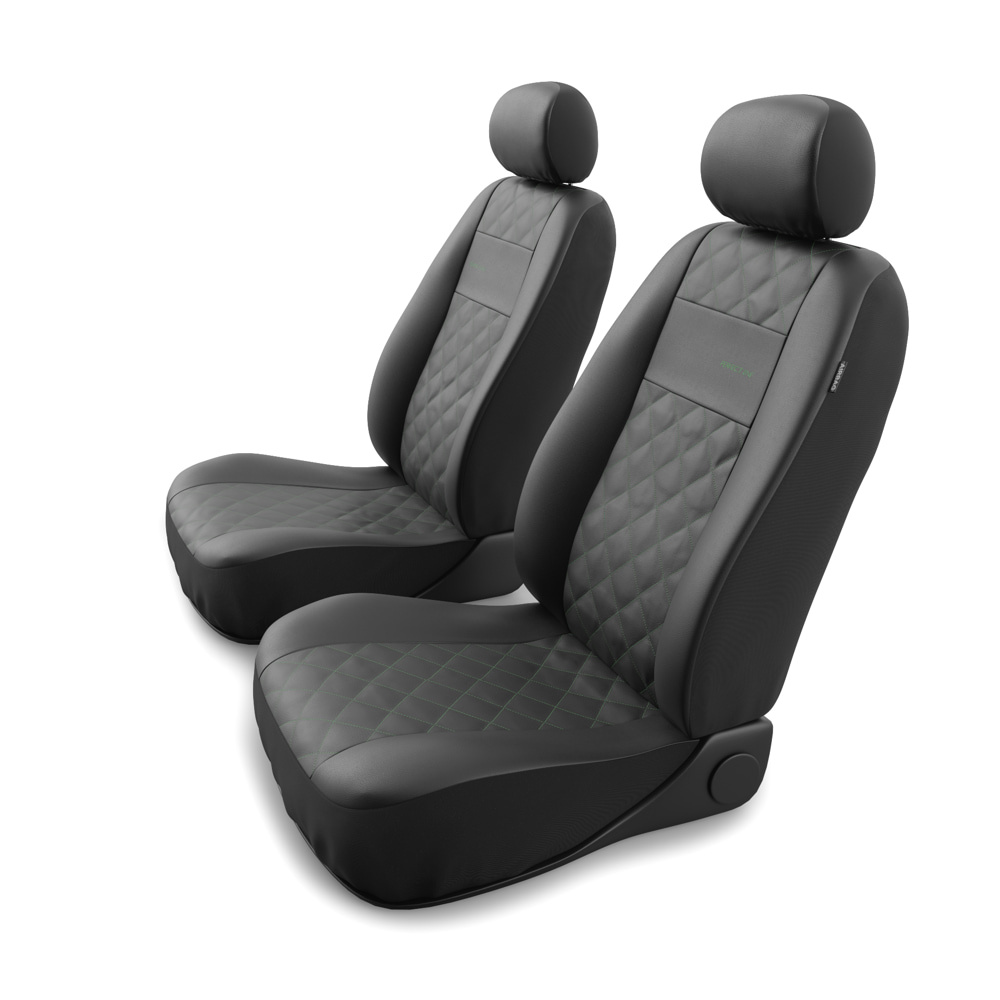 - Las fundas están fabricadas con cuero sintético resistente y antimanchas de color negro. En la parte central cuentan con un acolchado decorativo cosido con hilo de color verde. Las fundas delanteras están decoradas adicionalmente con un bordado.