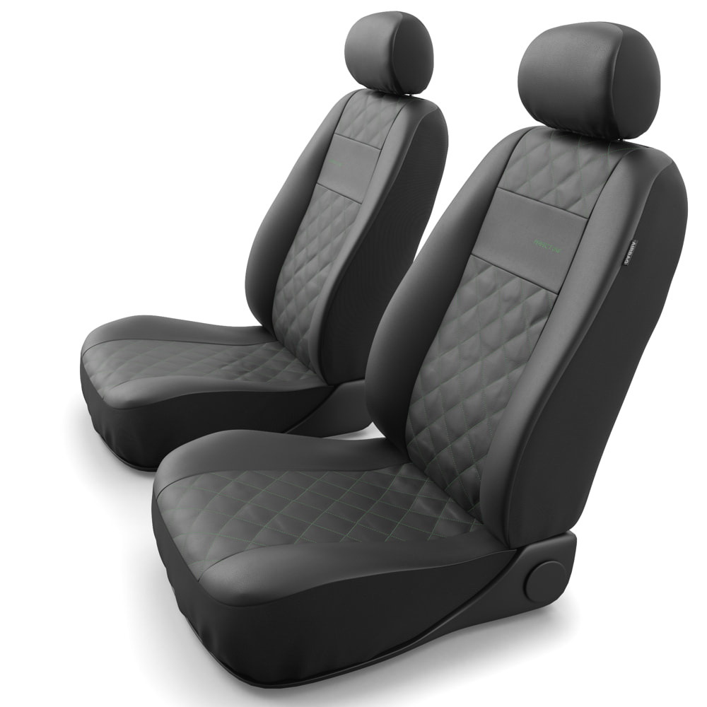 - Las fundas están fabricadas con cuero sintético resistente y antimanchas de color negro. En la parte central cuentan con un acolchado decorativo cosido con hilo de color verde. Las fundas delanteras están decoradas adicionalmente con un bordado.