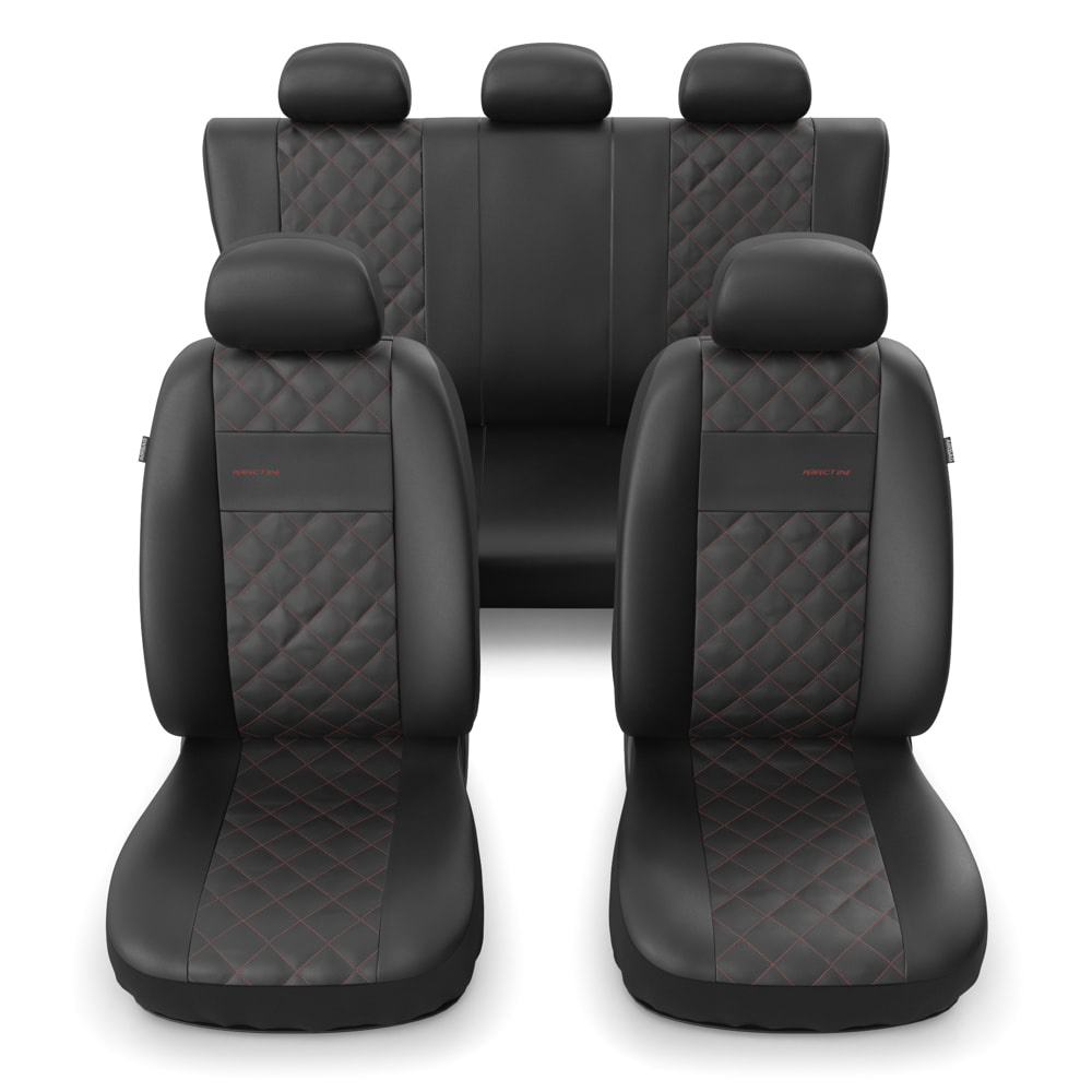 - Las fundas están fabricadas con cuero sintético resistente y antimanchas de color negro. En la parte central cuentan con un acolchado decorativo cosido con hilo de color rojo. Las fundas delanteras están decoradas adicionalmente con un bordado.