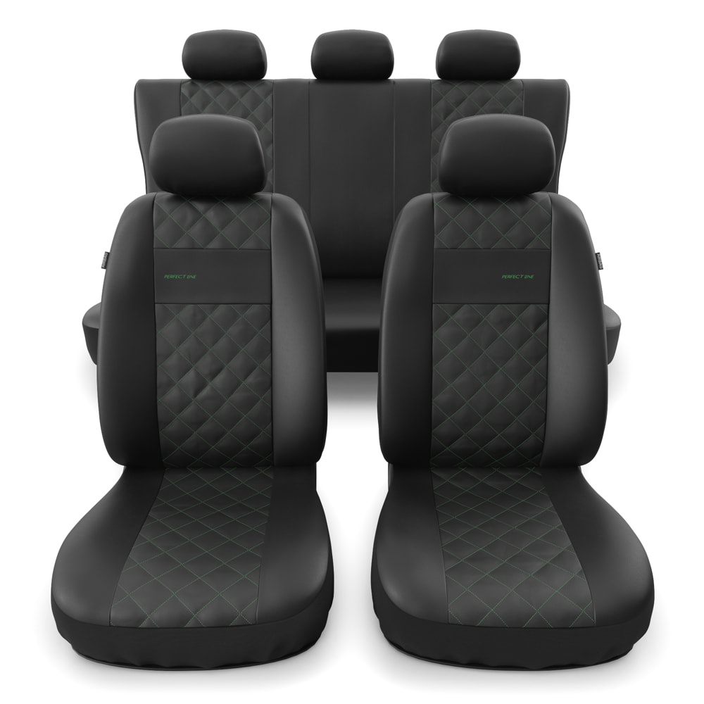 - Las fundas están fabricadas con cuero sintético resistente y antimanchas de color negro. En la parte central cuentan con un acolchado decorativo cosido con hilo de color verde. Las fundas delanteras están decoradas adicionalmente con un bordado.