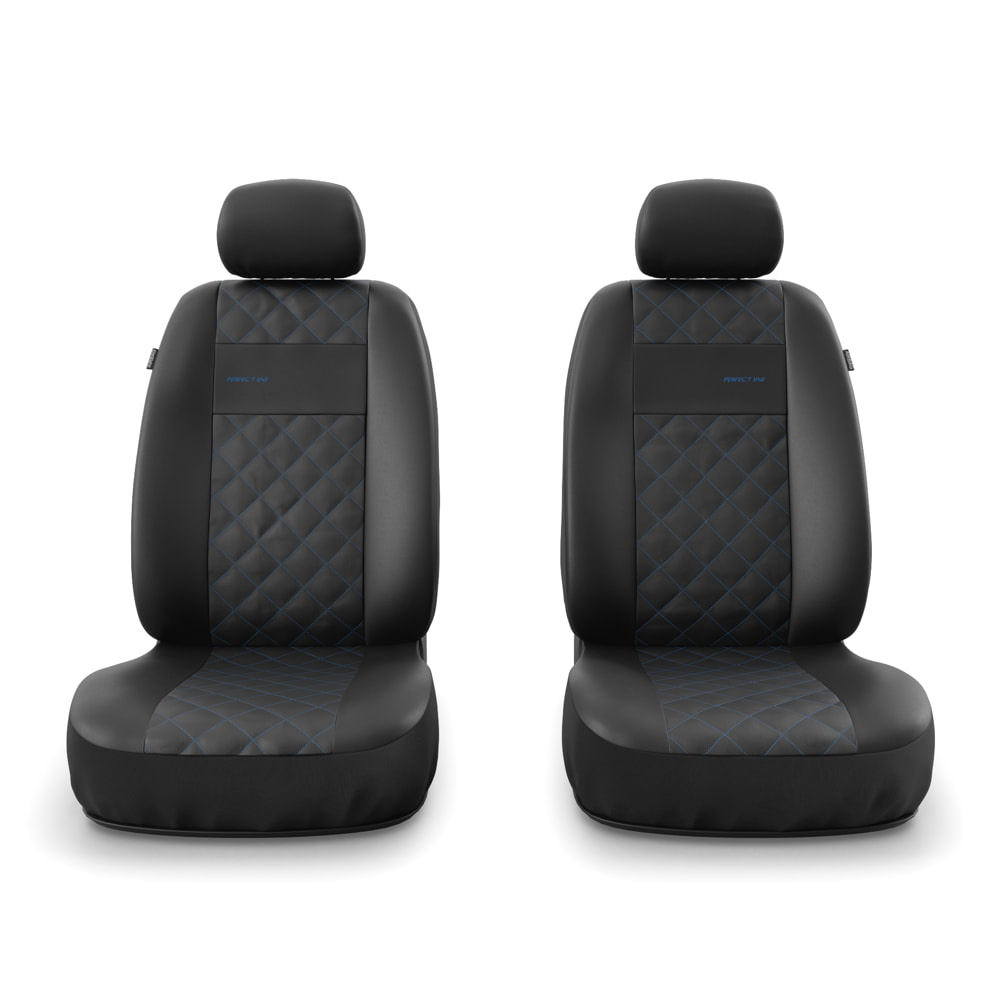 - Las fundas están fabricadas con cuero sintético resistente y antimanchas de color negro. En la parte central cuentan con un acolchado decorativo cosido con hilo de color azul. Las fundas delanteras están decoradas adicionalmente con un bordado.