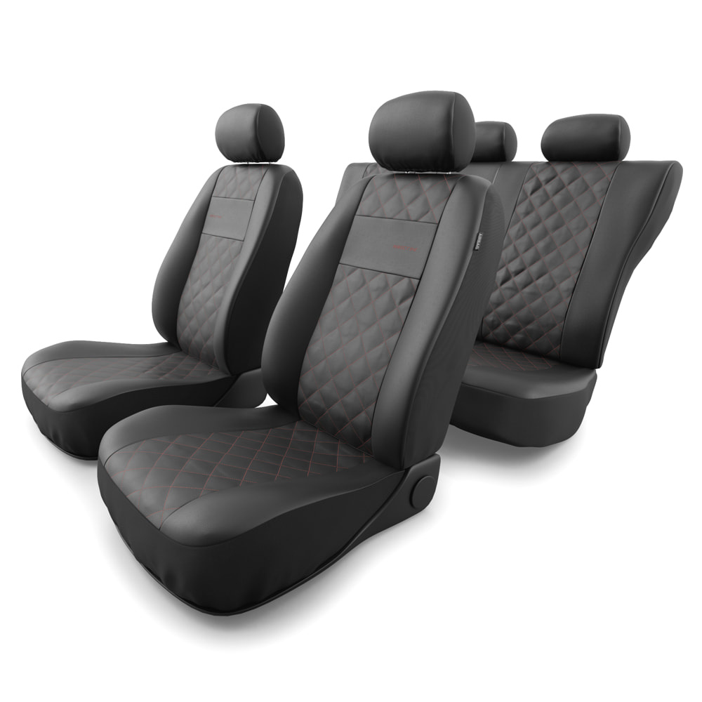 - Las fundas están fabricadas con cuero sintético resistente y antimanchas de color negro. En la parte central cuentan con un acolchado decorativo cosido con hilo de color rojo. Las fundas delanteras están decoradas adicionalmente con un bordado.