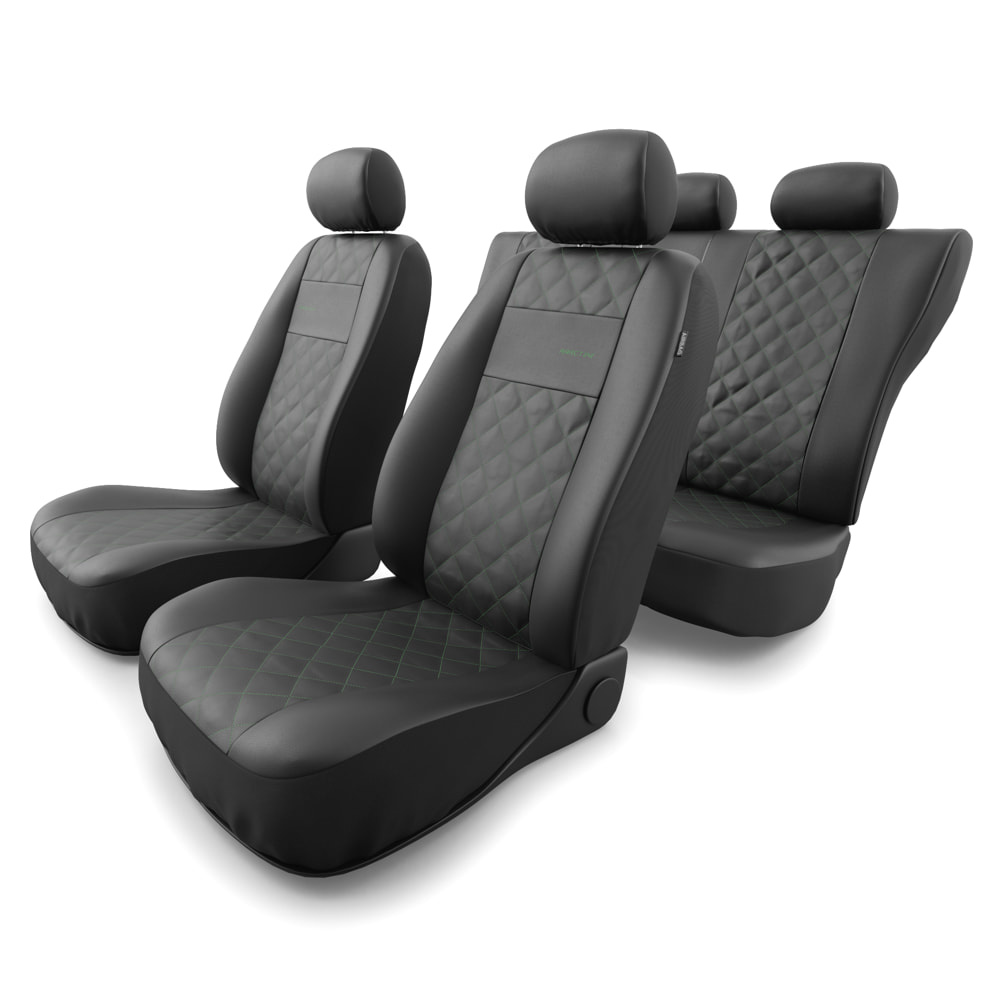 - Las fundas están fabricadas con cuero sintético resistente y antimanchas de color negro. En la parte central cuentan con un acolchado decorativo cosido con hilo de color verde. Las fundas delanteras están decoradas adicionalmente con un bordado.