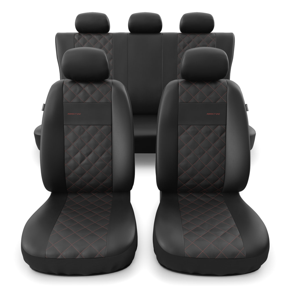 - Las fundas están fabricadas con cuero sintético resistente y antimanchas de color negro. En la parte central cuentan con un acolchado decorativo cosido con hilo de color rojo. Las fundas delanteras están decoradas adicionalmente con un bordado.