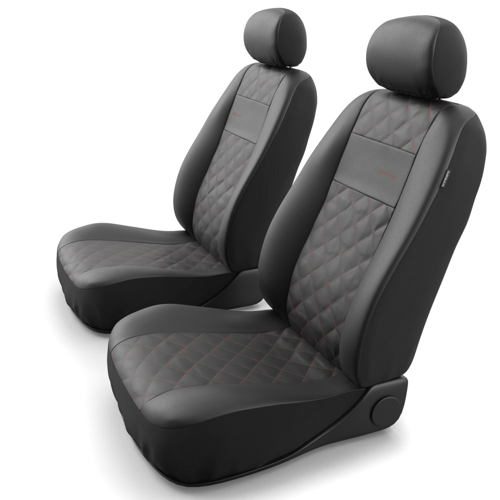 - Las fundas están fabricadas con cuero sintético resistente y antimanchas de color negro. En la parte central cuentan con un acolchado decorativo cosido con hilo de color rojo. Las fundas delanteras están decoradas adicionalmente con un bordado.