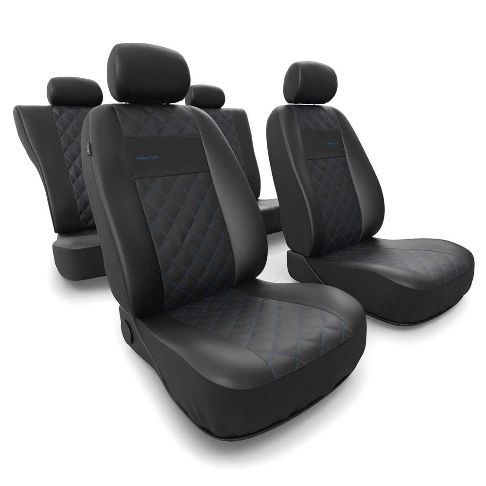 - Las fundas están fabricadas con cuero sintético resistente y antimanchas de color negro. En la parte central cuentan con un acolchado decorativo cosido con hilo de color azul. Las fundas delanteras están decoradas adicionalmente con un bordado.