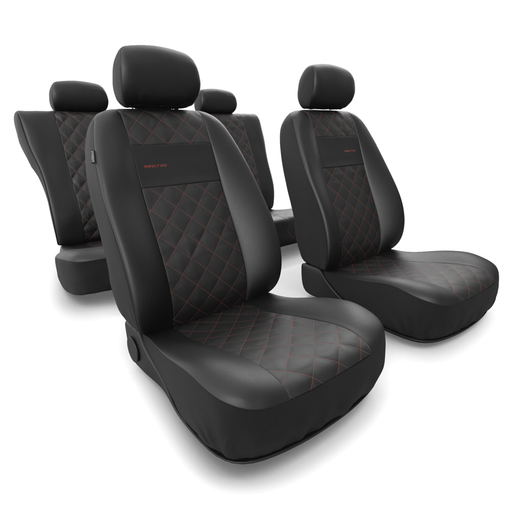 - Las fundas están fabricadas con cuero sintético resistente y antimanchas de color negro. En la parte central cuentan con un acolchado decorativo cosido con hilo de color rojo. Las fundas delanteras están decoradas adicionalmente con un bordado.