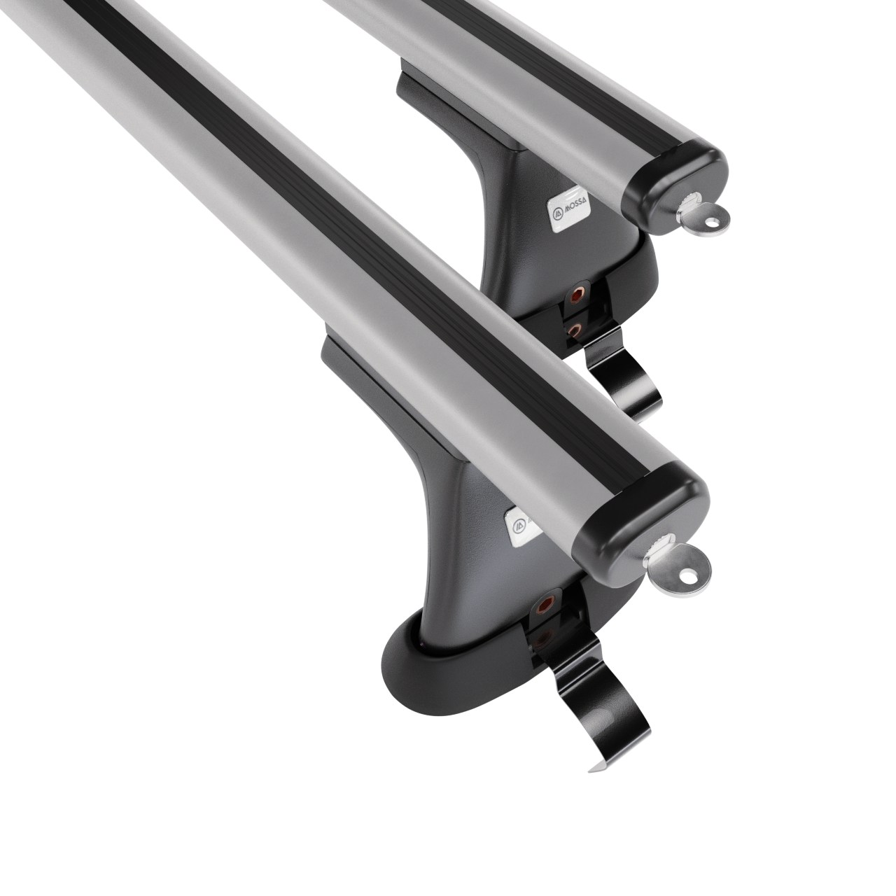 - La baca consta de 2 sólidas barras de aluminio y 4 soportes (patas), que se ajustan al techo de cada automóvil, teniendo en cuenta su modelo y generación.